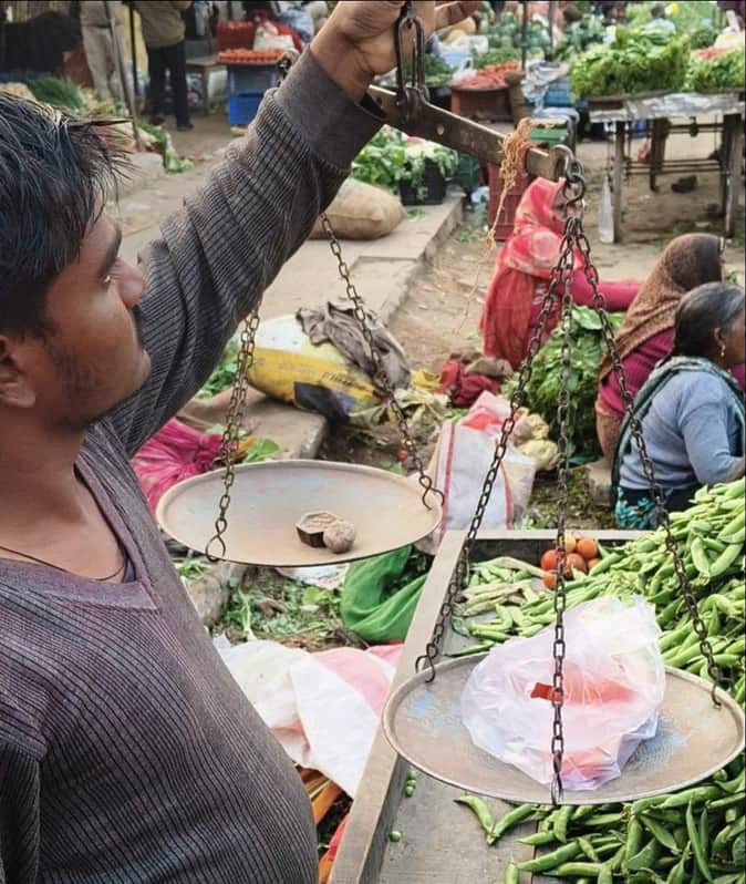 पीडीडीयू नगर में पत्थर के बटकरा से वजन करता सब्जी विक्रेता। संवाद