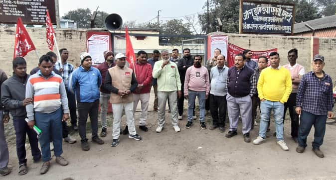पीडीडीयू नगर के प्लांटडिपो में प्रदर्शन करते ईसीआरकेयू के पदाधिकारी। स्रोत:-जागरूक पाठक