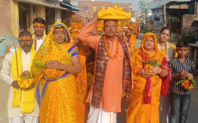 इलिया के खरौझा गांव में राम कथा के पूर्व निकली शोभायात्रा में शामिल भक्त। संवाद