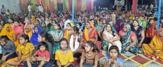 इलिया के खरौझा में कथा सुनती महिलाएं। संवाद