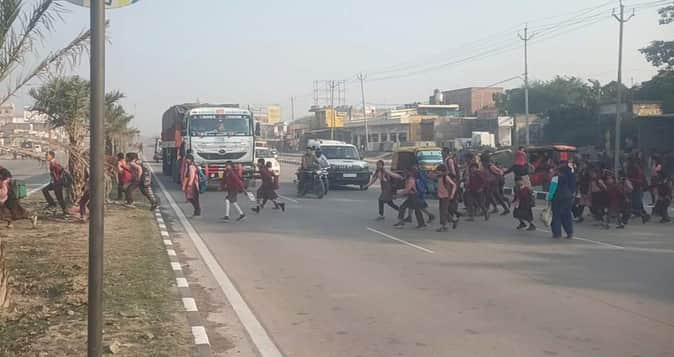 पीडीडीयू नगर-पड़ाव मार्ग पर दुलहीपुर के समीप सिक्स लेन पार करते कंपोजिट विद्यालय के बच्चे। संवा
