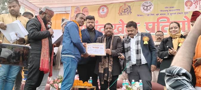 बरहज एसके इंटर कालेज खेल मैदान मं आयोजित सांसद खेल स्पर्धा के विजयी खिलाड़ी को पुरस्कृत करते ग