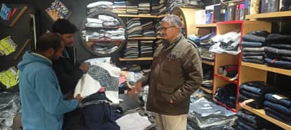 राघव नगर के एक शोरूम में ऊनी कपड़ा पसंद करते ग्राहक, फोटो संवाद