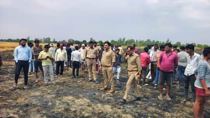 कस्बा जैथरा में फसल जल जाने की सूचना पर पहुंचे थाना प्रभारी रीतेश ठाकुर व पुलिसकर्मी। संवाद