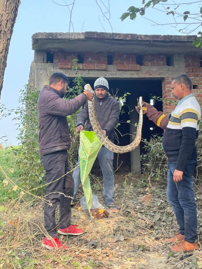 गांव निवासी फकीरेलाल के खेत में सिंचाई को सबमर्सिबल लगी है। सबमर्सिबल की देखरेख को एक छोटा सा कमरा बना है। कमरे के पास शनिवार की दोपहर दस फीट लंबा अजगर दिखने पर गांव में खलबली मच गई। अजगर देखने को मौके पर भीड़ जमा हो गई। जानकारी पर पहुंची वन विभाग की टीम ने पहले सभी ग्रामीणों को दूर किया। फिर अजगर को रेस्क्यू करते हुए पकड़ लिया। वन अधिकारी आदित्य सक्सेना ने बताया कि अजगर का वजन लगभग 50 किलो है। उन्होंने बताया कि मौसम में परिवर्तन होने पर वन्य जीव आबादी वाले क्षेत्र में अक्सर आ जाते हैं। इसलिए वन्य जीव मिलने पर घबराएं नहीं। उसके पास न जाएं, तत्काल वन विभाग की टीम को सूचित करें। रेस्क्यू टीम में वन विभाग के एसआई संजय कुमार सहित सचिन कुमार, धर्मेंद्र कुमार, उजीर सिंह, समरपाल मौजूद रहे।