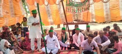 कस्बा मिरहची में अनिश्चित कालीन धरने में मौजूद भाकियू के राष्ट्रीय अध्यक्ष कैलाश लोधी व किसान।