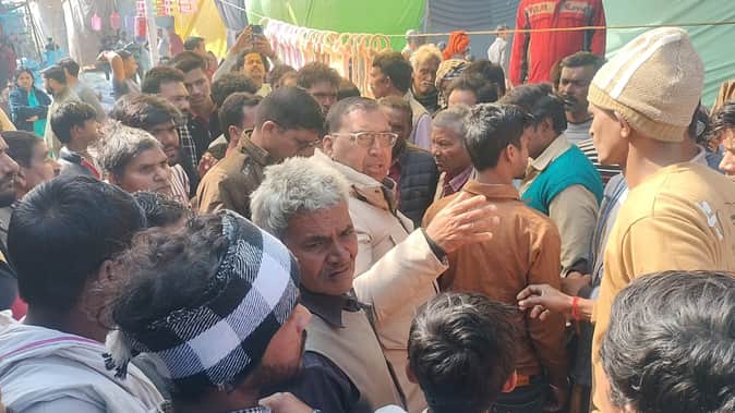 एटा महोत्सव में हंगामा करते दुकानदारों को समझाती पुलिस। संवाद