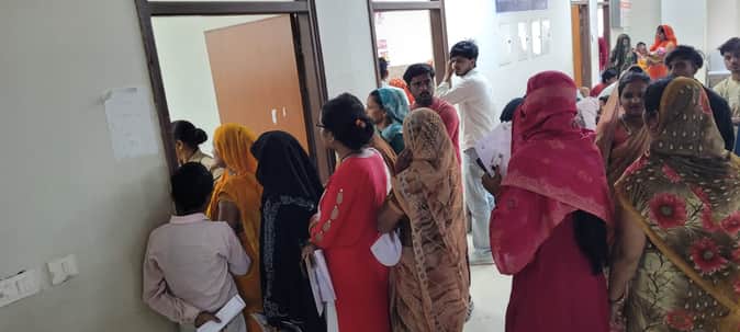 मेडिकल कॉलेज के स्त्री एवं प्रसूति रोग विभाग के बाहर उपचार लेने के लिए लाइन में लगी महिलाएं। सं