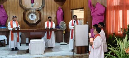 आगरा रोड स्थित सेंट फ्रांसिस जेवियर चर्च में प्रर्थना करते पादरी अरुल कुमार व अन्य। संवाद