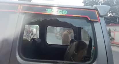 पथराव से कार का टूटा हुआ शीशा। संवाद