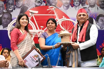 फोटो 30:::डॉ. सुनीता यादव को सम्मानित करते अखिलेश यादव। स्रोत स्वयं