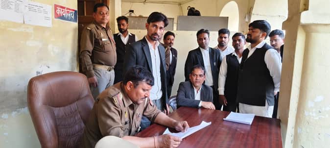 फोटो-6 कोतवाली में इंस्पेक्टर को तहरीर देने के दौरान बातचीत करते अधिवक्ता। संवाद