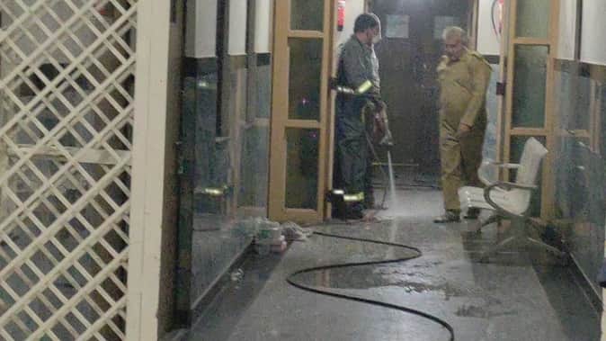 फोटो- 29 शहर के मसेनी चौराहा स्थित ग्लोबल हॉस्पिटल में गैस रिसाव होने के बाद बाहर ओटी की धुलाई