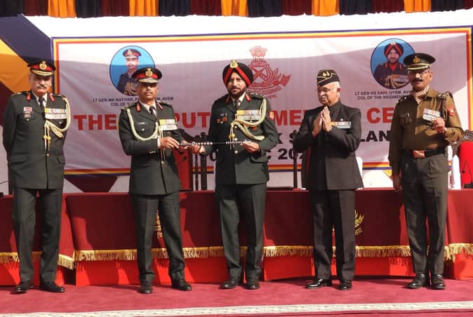 ले. जनरल हरजीत सिंह शाही को बैटन देते पूर्व कर्नल और द रेजिमेंट ले. जनरल मनोज कुमार कटियार।