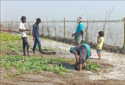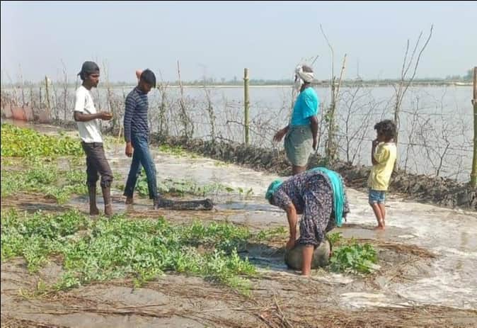 फोटो-10 तरबूज की फसल में पानी भरने से रोकने के लिए मेड़ बांधने का प्रयास करता किसान परिवार। स्र