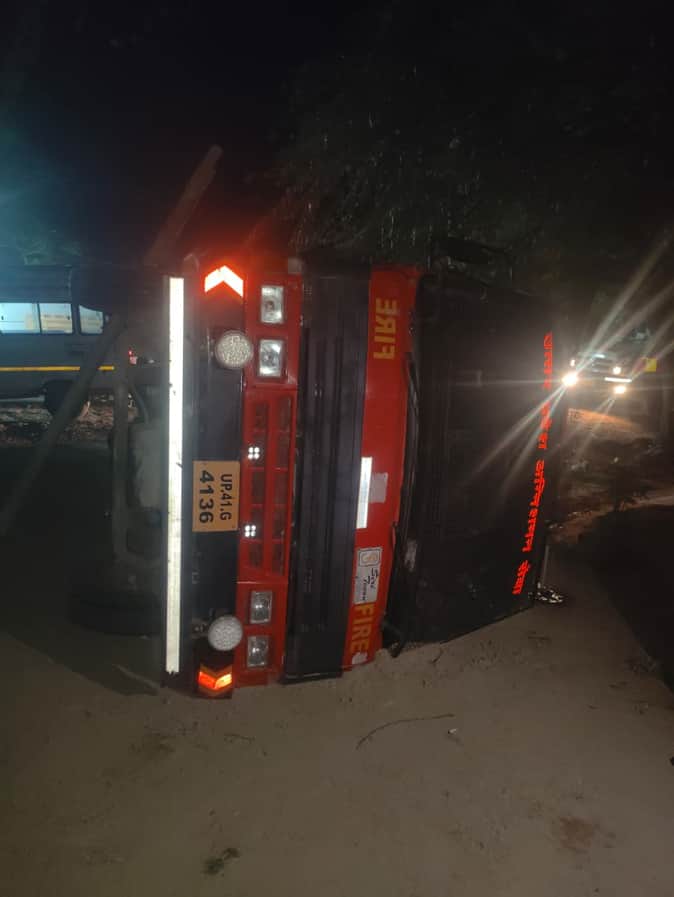 बिसनामऊ मोड़ पर पलटी पड़ी फायर ब्रिगेड की गाड़ी। संवाद