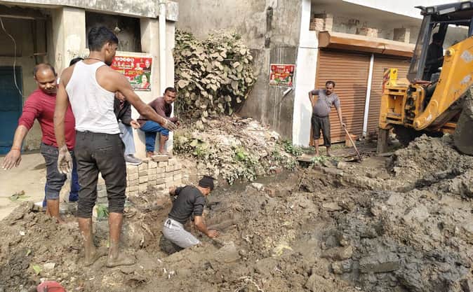 फोटो-09-पाइप लाइन का लीकेज ठीक करते नगर पालिका कर्मी। संवाद