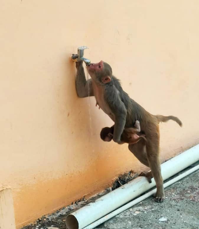 फोटो-04-दोपहर की तपती धूप में टोटी से प्यास बुझाता बंदर। संवाद