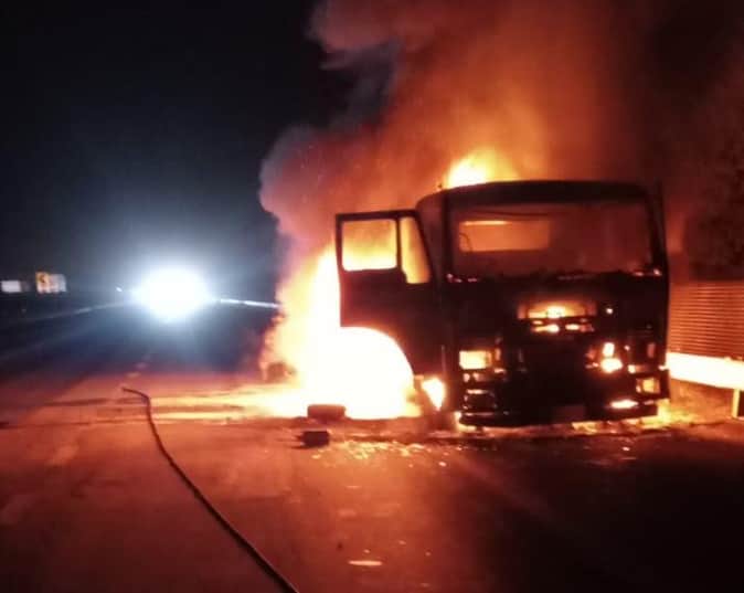 एक्सप्रेस-वे पर आग लगने के बाद जलता ट्रक। स्रोत यूपीडा