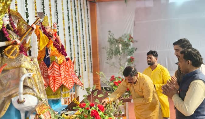 - फोटो : टूंडला के रेलवे मनोरंजन केंद्र पर मां सरस्वती पूजा महोत्सव में आरती करते अतिथि व अन्य लोग संवाद