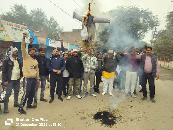 - फोटो : रसूलपुर क्षेत्र में बांग्लादेश का पुतला फूंकते हिन्दू वाहिनी के कार्यकर्ता। संवाद