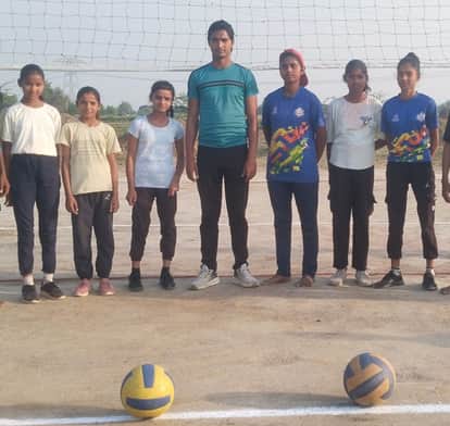 फोटो 31 गांव चांदपुर में बालिकाओं को वॉलीबॉल खेल की बारीकियां सिखाते कोच असलम खान। संवाद