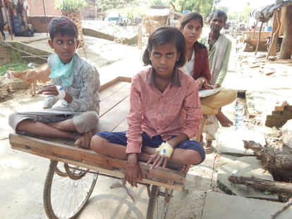 हाथ ठेले में बच्चों को बैठाकर कैंप ले जाता ग्रामीण।