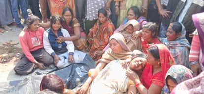 उतरौली चट्टी पर रामकृत राजभर के शव को एनएच-124सी पर रखकर रोते बिलखते परिजनों को संभालती महिलाए