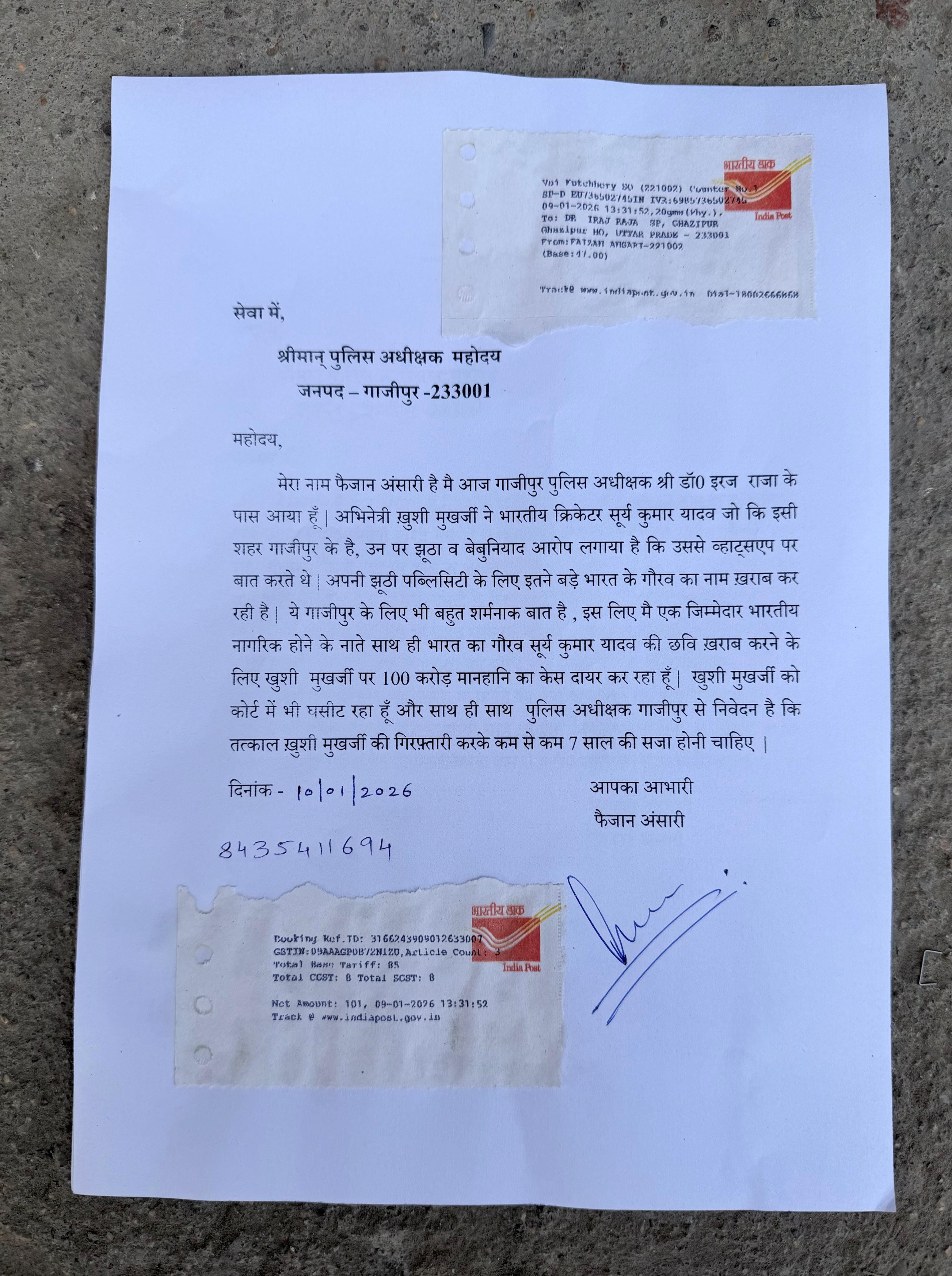 मुंबई निवासी फैजान अंसारी का पत्र वायरल हो रहा है। इसमें वह अभिनेत्री खुशी मुखर्जी की गिरफ्तारी के लिए गाजीपुर एसपी डॉ. ईरज राजा से गिरफ्तारी की मांग कर रहे हैं। यही नहीं उन्होंने पत्र में लिखा कि क्रिकेटर सूर्य कुमार यादव पर अभिनेत्री का आरोप झूठा व बेबुनियाद है। फैजान अंसारी ने बीते 10 जनवरी को पत्र भेजा था। उधर, एसपी ने ऐसे किसी तरह के पत्र मिलने और कार्रवाई से इनकार कर दिया। हालांकि वायरल पत्र का संवाद न्यूज एजेंसी पुष्टि नहीं करता है।