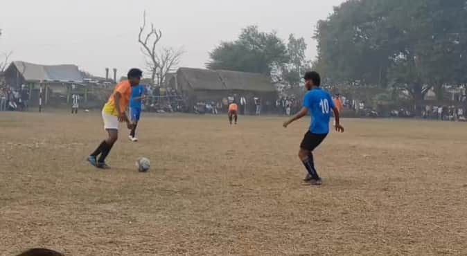 जीवपुर गांव में आयोजित फुटबॉल प्रतियोगिता में गेंद पर कब्जे की कोशिश करते खिलाड़ी। संवाद