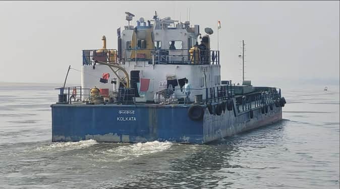 बच्छलकापुरा- रामपुर पीपा पुल से निकलता लाल बहादुर शास्त्री मालवाहक जहाज। संवाद