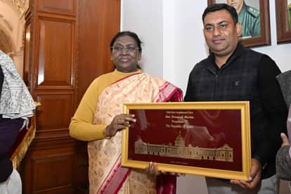 राष्ट्रपति भवन में परमवीर चक्र विजेता वीर अब्दुल हमीद के पौत्र जमील आलम को स्मृति चिंह देतीं रा