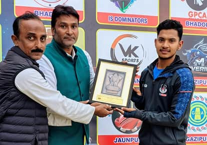 मूंसीलाटपुर टी-20 प्रतियोगिता में पहुंचे उप्र अंडर-19 खिलाड़ी शवम शुक्ला को सम्मानित करते आयोज