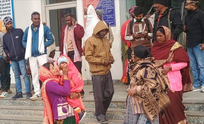 ठंड से बचाने के लिए गोराबाजार स्थित मेडिकल कॉलेज अस्पताल के पास बच्चे को कंबल से ढकती महिला। सं