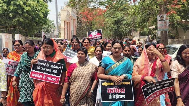 पीजी कॉलेज गेट के पास भाजपा महिला मोर्चा और भाजयुमो के विरोध प्रदर्शन में शामिल राज्यसभा सांसद