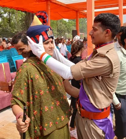 पुलिस लाइन मैदान में रविवार को पासिंग आउट परेड करते रिक्रूट और बेटे चंदन शुक्ल ने पुलिस की पगड़