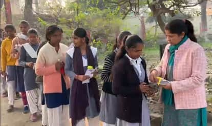 परीक्षा केंद्र पर छात्राओं की चेकिंग करतीं अध्यापिका।