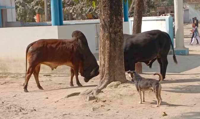 थाने में लड़ते सांड़।
