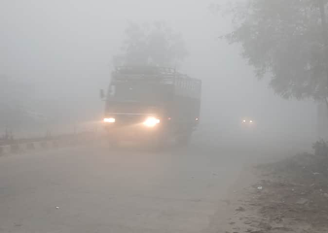 लखनऊ हाईवे पर हारीपुर के पास कोहरे में हेडलाइट जलाकर जाते वाहन। - संवाद