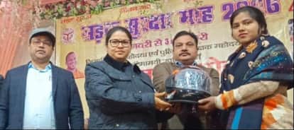 कटाचार्य क्लब में हेलमेट वितरण करती जिलाधिकारी प्रियंका निरंजन। स्रोत: सूचना विभाग