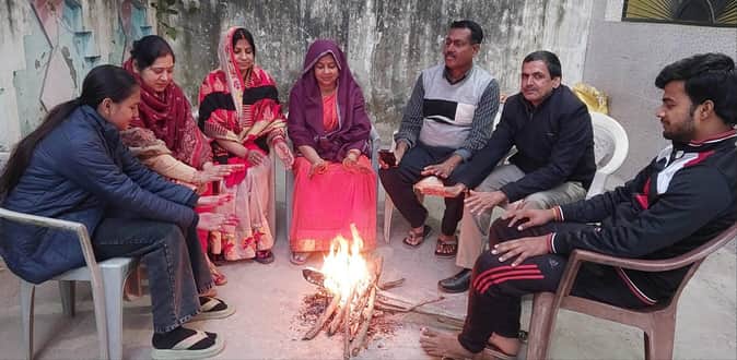 जानकीनगर प्रजापतिपुरम कॉलोनी में घर में अलाव तापते लोग। - संवाद