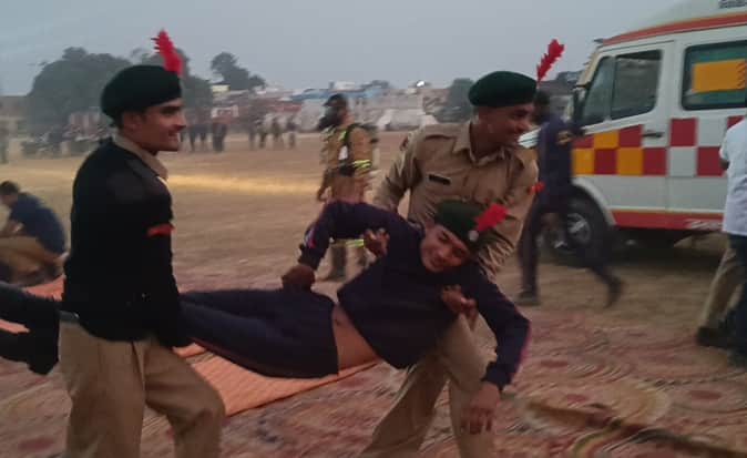 गोंडा के शहीदे आजम सरदार भगत सिंह इंटर कॉलेज में मॉकड्रिल के दौरान घायलों को ले जाते एनसीसी के