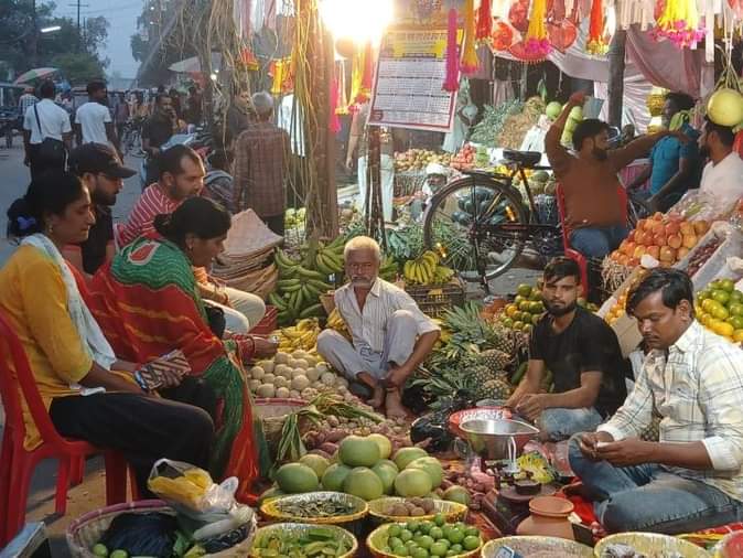 बड़गांव में छठ पूजा के लिए फल व अन्य सामग्री खरीदतीं महिलाएं। - संवाद