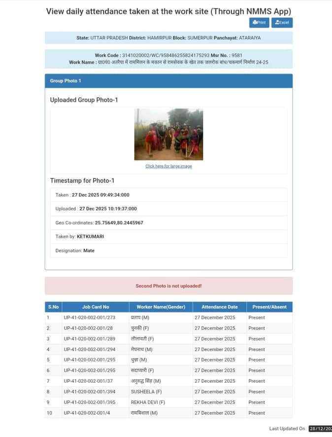 ग्राम पंचायत अतरैया में राममिलन के मकान से रामसेवक के खेत तक तथा रामसेवक के खेत से चुनुवाद के खेत तक अलग-अलग दो जलरोक बांध एवं चकमार्ग का निर्माण कराया जा रहा है। इसमें सात मस्टररोल में 66 मजदूरों को कार्य करते हुए दिखाया गया है। गत 27 दिसंबर को एनएमएमएस एप में अपलोड की गई तस्वीरें एवं मस्टर रोल में दर्ज की गई हाजिरी में फर्क है। मस्टर रोल संख्या 9580 से 9586 तक में मजदूरों के नाम तो अलग-अलग हैं, लेकिन फोटो में वहीं 10-15 मजदूरों की फोटो अपलोड है। यह फोटो महिला मेट केत कुमारी ने अपलोड की है। दोनों कार्यों में एक ही जैसे मजदूरों की फोटो अपलोड की गई है।