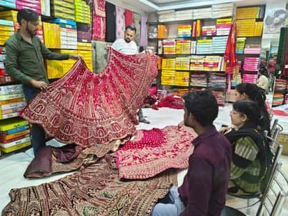 फोटो 15 एचएएमपी 01- शहर के सुभाष बाजार स्थिति एक दुकान में लहंगा देखते ग्राहक। संवाद