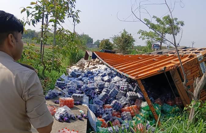 बुलंदशहर रोड पर पलटा कोल्ड ड्रिंक से भरा ट्रक। संवाद