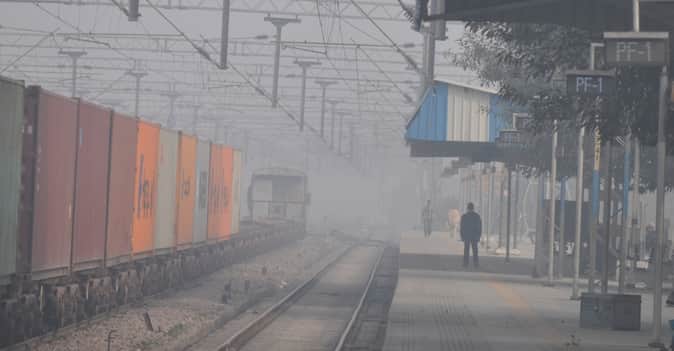 रेलवे स्टेशन पर सुबह के समय धुंध में जाती मालगाड़ी। संवाद