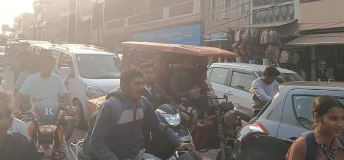 पिलखुवा में गांधी रोड पर जाम में फंसे वाहन। संवाद
