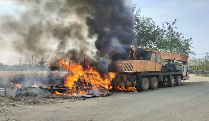 धौलाना में सड़क पर खड़ी क्रेन में लगी आग। संवाद