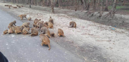 गढ़ नगर में सड़क किनारे बैठा बंदरों का झुंड। संवाद